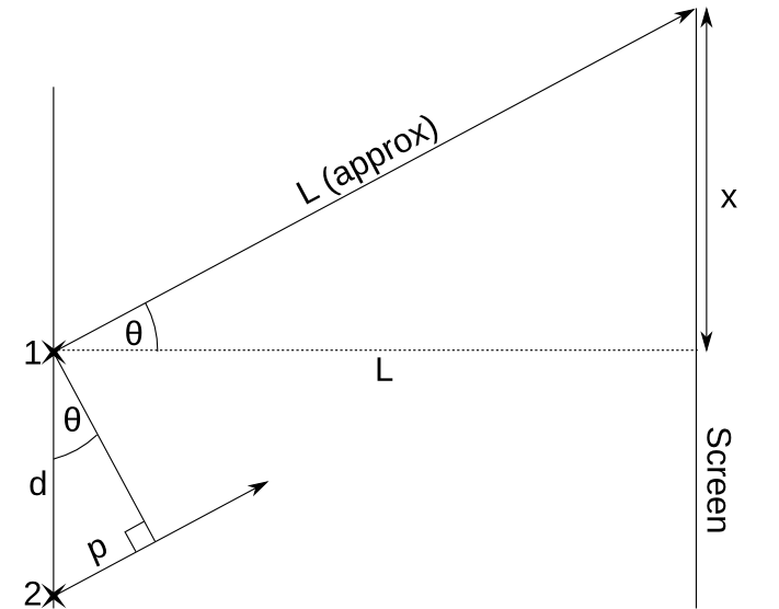 At this point, we have to engage in some slightly dodgy maths. In the following diagram, p is path difference, L is the distance from the slits to the screen and x is the perpendicular distance from a fringe to the normal: