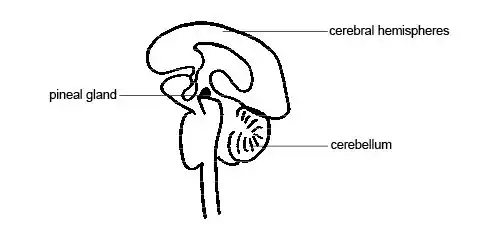 The pineal gland is found deep within the brain (see diagram 16.4). It is sometimes known as the ‘third eye” as it responds to light and day length. It produces the hormone melatonin, which influences the development of sexual maturity and the seasonality of breeding and hibernation. Bright light inhibits melatonin secretion Low level of melatonin in bright light makes one feel good and this increases fertility. High level of melatonin in dim light makes an animal tired and depressed and therefore causes low fertility in animals.