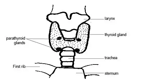 The thyroid gland is situated in the neck, just in front of the windpipe or trachea (see diagram 16.5). It produces the hormone thyroxine, which influences the rate of growth and development of young animals. In mature animals it increases the rate of chemical reactions in the body.