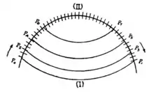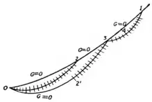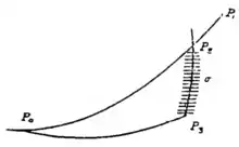 Let a portion of curve . satisfying the differential equation , be given, which is of such a nature that for no point on it or , and suppose that the point conjugate to does not lie before . Between and take an arbitrary point and draw through a regular curve.[1] On this curve we choose a point so close to that a curve may be drawn through and which satisfies the differential equation , and which lies entirely within the strip of surface defined above. Let us consider the change in the integral when we take it over instead of over . We may denote an integral taken over a curve that satisfies the differential equation by , and one over an arbitrary curve by , and we may denote the direction of integration by added indices. We have therefore to compute the expression