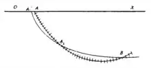 If, on the other hand, along the whole curve , then this curve must consist of several cycloidal arcs ; since, if it were only one, the curves and would be identical. These arcs must have different tangents at the point where they come together ; for, since this point cannot lie on the -axis, a consecutive point having the same direction must lie on the same cycloidal arc. If corners were present, however, they could be so rounded off that there would be a shorter path between the two points, and consequently, the velocity being the same, the time of falling would be shorter.