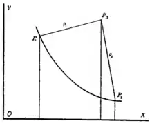 Between the ordinates at and draw a line parallel to the -axis, and on this line take a point whose ordinate is longer than those of the points and . Draw the straight lines and , and let and be the values of for these lines. The integral taken over the broken line may be denoted by , where