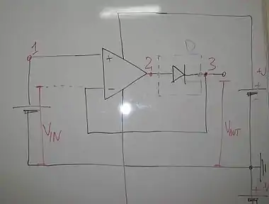 We have a source voltage Vin and at the point named "1" we will have that voltage. However, if we want to compensate the voltage drop across the diode, we should use an op-amp that will have on its output a voltage equal to the source voltage plus an additional amount that is equal to this voltage drop. This will be the voltage we will have at point "2". If this increased voltage is applied before the diode, the voltage after the diode will be the same as our initial source voltage and that is what we have at point "3". Which is our purpose!