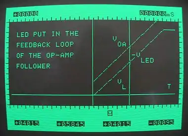 The op-amp "raises" its output voltage to compensate the harmful voltage drop across the LED (waveforms).