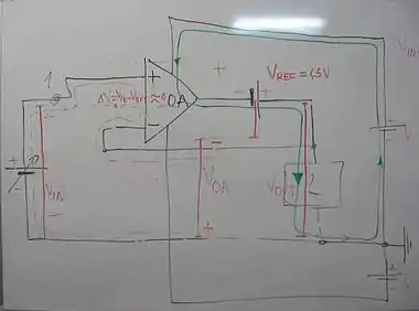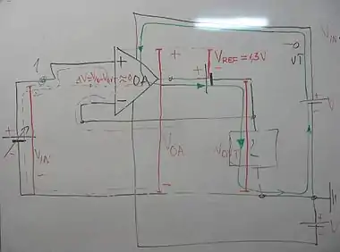 Firstly, let's remind what an operational amplifier (op-amp) is: it's a device having a differential input (it may be current, voltage, mechanical motion?!?Circuit-fantasist (talk) 18:09, 7 May 2008 (UTC), etc.) and the output that varies according to the input but with a larger amplitude. Almost always they are used with negative feedback (the output signal is returned to the input in opposite direction to the source signal). However, they may be also used with a positive feedback (the output signal that is returned is summed with the input original signal) but much rarely. For ideal OA in a negative-feedback circuit, the network returns a fraction of the output to the inverting input and thus makes the differential input voltage toward zero.