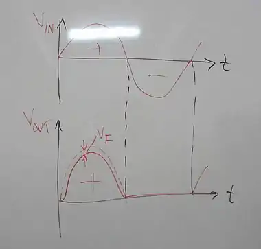 When the source voltage is positive, the diode is in the so-called forward-bias region. If the diode was ideal the source voltage will appear across the load. However, the diode we have is not ideal; so it performs a voltage drop equal to the push-up voltage of the diode (approximately 0.5 - 0.7V). So during the positive wave the output voltage is less than the source voltage (for our example it will be VL = VS - VF = 1 - 0.7 = 0.3V. The result is shown in the diagram on the right.