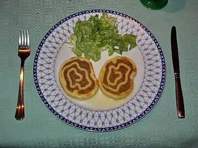 Fleischnacka or Fleischschnacka,[1] literally "snails of meat" (from German "Fleisch", meat, and "Schnecke", snail) is an Alsatian dish consisting of minced beef (or sometimes other meats, like left over pot-au-feu) rolled in fresh noodle dough and cut into slices which are then cooked in stock.