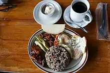 Gallo pinto, served at breakfast with fried eggs, plantain, bacon, avocado, a corn tortilla and sour cream