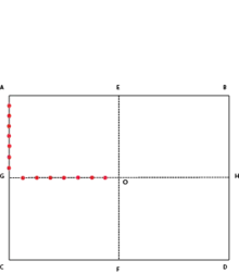 1. Create a rectangle ABCD. Find the midpoints of each line and connect the points to divide the rectangle into quadrants. Divide AG and GO into equal number of parts using the division method.