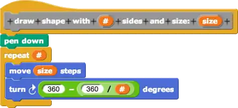 With the number of sides we can determines the internal angle of the shape, which is all we need to draw the shape. Please checkout this resource if you are not sure how to calculate the internal angle using the number of sides. This block can serve as an abstraction of the tasks of drawing equal-lateral shapes (polygons). You may have noticed the length of the sides is hard-coded (typed in as a constant not a parameter). What if we want to draw shapes of different size? We can further generalize the function of the block by adding anther parameter and use it to control the side length.
