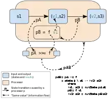 pAB) from a state processor (pA) and a processor-making function (f). s1, s2 and s3 are states. v1 and v2 are values. pA, pB and pAB are state processors. The wrapping and unwrapping by State/runState is implicit.One detail in the implementation is how runState is used to undo the State wrapping, so that we can reach the function that will be applied to the states. The type of runState p, for instance, is s -> (a, s).