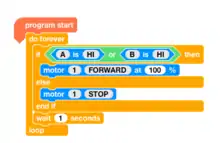 The OR activity Using the A & B inputs write a program to light the motor LED when A OR B is hi.