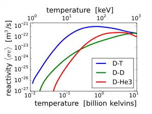 The fusion reaction rate increases rapidly with temperature until it maximizes and then gradually drops off. The DT rate peaks at a lower temperature (about 70 keV, or 800 million kelvins) and at a higher value than other reactions commonly considered for fusion energy.