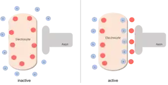 The cells can be activated by the neurotransmitter acetylcholine which travels through the synaptic gap between the axon and the cell. The release of acetylcholine results in the opening of the ion channels along the membrane of the electrocytes. The positively charged ions from the cellular surrounding now start to flood into the cell. The channels on the side located closer to the nerve ending will open before the ones located at the opposite side of the cell, which creates a temporary potential gradient [19], shown in the Figure.