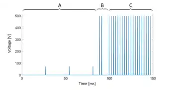 Electric eels use active electrolocation to navigate through the water [22] [23]. Electrolocation is the sense to detect objects in the environment through distortions in a self generated electric field [24]. The electric eels generate a low voltage electric field and use the electroreceptors on their head to perceive distortions in the field [22] [23]. Such differences in the field strength are caused by any object, since the conductivity varies from the one of water. When hunting, electric eels generate a high voltage doublet (two short high voltage pulses) which remotely activates the motor neurons of their prey and leads to involuntary twitching [17]. Thereby, the prey creates disturbances in the water and thus reveal its location. These water distortions are then detected by the mechanoreceptors on the head of the eels. After the discovery of their prey, the eels move to a strike. A fast reaction time is crucial to avoid the escape of the prey [17]. A typical voltage sequence produced by an electric eel during hunting is shown in the attached Figure: Low frequency electrolocation (A) to locate the prey is followed by a high voltage doublet (B) to cause a twitching and finally the attack is executed with high voltage and high frequency volleys (C), which will be explained in the next section.