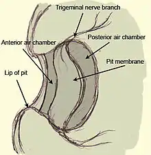 Structure of the pit organ. The width of the hollow is half the size of the membrane that separates the two air-filled chambers. The dendrites of the trigenimal lie in the membrane's back. The infrared beams are projected like in a pinhole camera.