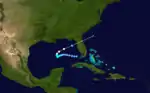 A low-pressure area centered the Gulf of Mexico on September 25 and was designated as a tropical depression hours later.[8] Turning west-southwestward, the storm gradually intensified, attaining tropical storm-status on September 27. The next day, the system nearly stalled close to the center of the Gulf of Mexico.[4] On September 28, further development of the storm took place and ships in the vicinity of the storm reported a strong gale.[8] The next day, the storm strengthened into a hurricane.[4] Several hours later, nearby ship reported a pressure of 987 mbar (29.1 inHg), the lowest pressure associated with the hurricane.[13] Around this time, the storm reached its peak intensity with winds of 85 mph (140 km/h); the storm also began to turn northeastward at this time. The hurricane then accelerated and began weakening. Early on September 30, the storm made landfall near Cedar Key, Florida, with winds up to 65 mph (100 km/h) before transitioning into an extratropical cyclone over Florida. Later that day, the remnants dissipated over the eastern Atlantic Ocean.[4]