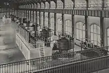 The Niagara Power Station No. 1, as it was then called, would eventually generate 50,000 horsepower (37 MW) of electricity. There were 10 generator rated 5,000 horsepower (3.7 MW) of the outside revolving field, vertical shaft type. The generators were separated into two banks of five generators each with independent switchboards. The output was at 2,000 volts to serve in and around Niagara Falls. There were transformers to step up the voltage to 10,000 volts to serve the medium distance around Niagara Falls areas. The voltage was also stepped up to 20,000 to serve the longer distance for Buffalo, Lockport, and Tonawanda. The station was the model for a second similar station built in 1904.[6] The entire plant was officially named after Edward Dean Adams in 1927.