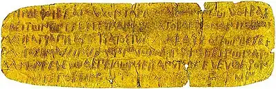 MS 5236 (inventory number of the Schøyen Collection) is an ancient Greek amulet of the 6th century BC, which is unique in two respects: it is the only known magic amulet of the time inscribed with a text that was stamped as opposed to incised, and it is the only extant specimen of ephesia grammata made of gold. The only partially comprehensible inscription is an invocation of the god Phoebus Apollo and may have been composed in central Greece or western Asia Minor. As such magical amulets are known to have been mass-produced, the existence of MS 5236 indicates that, despite the singularity of the foil, an inkless block printing process was practised in ancient Greece to a certain degree,[1][2] for texts of some length, beyond the examples known from Roman lead pipe inscriptions and the many types of stamps used to mark bricks and pottery with the maker's name and other details.