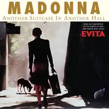 The song was officially released as the soundtrack's third single on 18 March 1997 in Europe.[21] Originally, there were talks about releasing an Evita EP, containing remixed versions of "Buenos Aires", "Don't Cry for Me Argentina" and "Another Suitcase in Another Hall", but it did not materialize.[22] In the United Kingdom, the song peaked at number 7 on the UK Singles Chart, the week of 29 March 1997, and was present on the top 100 for a total of 8 weeks.[23] According to the Official Charts Company, the single had sold 75,233 copies in the United Kingdom as of August 2008.[24] The song also reached a peak of number 23 on the Irish Singles Chart, where it remained for 3 weeks.[25] Elsewhere, it had a relatively poor chart performance; in Sweden it peaked at number 60, while in the Netherlands it peaked at number 91.[26][27] "Another Suitcase in Another Hall" was Madonna's first single released in Australia to miss the ARIA top 100.[28]