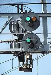 In 1954, the PRR experimented installing red lenses in the horizontal position of the upper head to help increase the at distance visibility of absolute Stop signals at Overbrook interlocking.[6] Under the Penn Central and later Conrail it became standard practice to add these red lenses to high position lights and even some pedestal signals. The Norfolk and Western modified its signals to use red and green lenses in the upper head Stop and Clear positions and yellow lenses everywhere else. In the 1980s Amtrak modified most of its former-PRR position lights to use the equivalent color light colors in all of the positions of both heads. Internally referred to as position color lights, these are not to be confused with color position lights described below, which while functionally similar are structurally considerably different.[5]