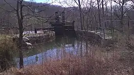 A village arose around the mill, taking its name. It was home to over 450 people, of whom over half worked in the mill.[7] Some residents immigrated from as far as Durham and Raleigh to find employment in Avalon. A few African-Americans also lived at the outskirts of the village and worked in the mill's dye house.[8] In addition to the mill, the town consisted of a dam and artificial canal, 60 company houses, a boarding house, a hotel, a company store, an ice cream parlor and a Moravian Church.[3][9] The second story floor of the store was used to host a school.[10] Electricity came from a water-powered generator at the mill.[3] No formal government was ever established in Avalon, so most events were either centered around the church or the mill.[11] On November 23, 1908 a fire destroyed the company store, causing an estimated $20,000 in damage.[12]