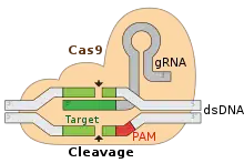 - ↑ Dominguez AA, Lim WA, Qi LS (January 2016). "Beyond editing: repurposing CRISPR-Cas9 for precision genome regulation and interrogation". Nature Reviews. Molecular Cell Biology. 17 (1): 5–15. doi:10.1038/nrm.2015.2. PMC 4922510. PMID 26670017.