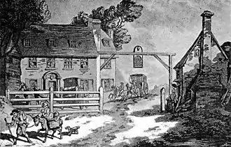 Painting of the first Cock Hotel in Sutton, Surrey by Thomas Rowlandson in 1789.[1]