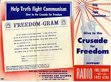 - 1 2 Cummings, Radio Free Europe's "Crusade for Freedom" (2010), pp. 2, 3. "From 1950 to 1960, millions of Americans throughout the United States willingly and enthusiastically signed 'Freedom Scrolls' and 'Freedom-Grams,' participated in fund-raising dinners and lunches, attended 'Crusader' meetings, marched in parades, launched large balloons filled with leaflets, participated in writing contests, bowled in tournaments, and otherwise were active in the belief that they were individually and collectively supporting Radio Free Europe in the battle against Communist aggression in Europe. [...] Thousands of local volunteer 'Crusaders' used their imagination, creativity, and willpower to keep the campaigns moving for ten years."