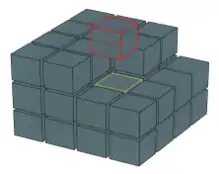 Schematic of a small part of a growing crystal. The crystal is of (blue) cubic particles on a simple cubic lattice. The top layer is incomplete, only ten of the sixteen lattice positions are occupied by particles. A particle in the fluid (shown with red edges) is joining the crystal, growing the crystal by one particle. It is joining the lattice at the point where its energy will be a minimum, which is in the corner of the incomplete top layer (on top of the particle shown with yellow edges). Its energy will be a minimum because in that position it has three neighbors (one below, one to its left and one above right) which it will interact with. All other positions on an incomplete crystal layer have only one or two neighbours.