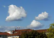 Cumulus clouds are clouds that have flat bases and are often described as puffy, cotton-like, or fluffy in appearance. Their name derives from the Latin cumulus, meaning "heap" or "pile".[1] Cumulus clouds are low-level clouds, generally less than 2,000 m (6,600 ft) in altitude unless they are the more vertical cumulus congestus form. Cumulus clouds may appear by themselves, in lines, or in clusters.