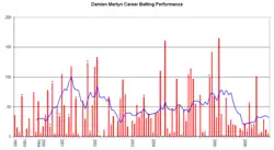 However, his performances were unconvincing, totalling 168 runs at 28.16 for the series, passing 50 only once with an unbeaten 67* at the MCG.[1][5] Martyn was also a member of the ODI squad in that season, playing less regularly in only four of eleven matches, and aggregating 45 runs at 22.5.[6]