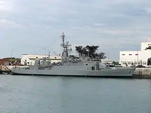 The first two ships of the class were built in 1977 in France for the South African Navy. The sale was embargoed by United Nations Security Council Resolution 418 during sea trials and the ships bought by Argentina instead on 25 September 1978.[1] A third ship was ordered and entered service as ARA Granville on 22 June 1981,[1] in time for the Falklands War the following year. There are minor differences in equipment fit compared to her sisters, for instance Granville has French Dagaie decoys rather than the British Corvus chaff launchers.[1]