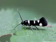 The wingspan is about 8 millimetres (0.31 in). Adults are on wing in July in one generation per year.[2]