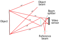 The reference beam is an expanded beam derived from the laser beam, and is added to the image of the object which is formed on the video camera.