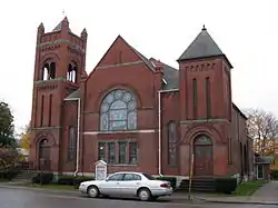 First Presbyterian Church is a historic Presbyterian church located at Dundee in Yates County, New York. It is a Romanesque style brick structure, with limestone and terra cotta trim, built in 1895. It is distinguished by two multi-story towers, broad cross gables, bold, turret-like pinnacles and finials, and finely crafted corbelled brock trim.[2]