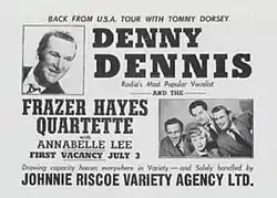 Around 1949, the popular 1930s and 1940s singer Denny Dennis teamed up with the original Fraser Hayes Quartette (who were to eventually become the Fraser Hayes Four). Dennis initially financed the venture, and the new group was to prove successful. In June 1950, they appeared on the BBC Radio show Variety Fanfare, and were given positive comments by the critics. However, in January 1951, Dennis withdrew, possibly in part due to the financial pressures of maintaining such a group.