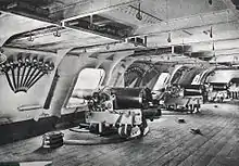 Gunports were pierced on the side of the hull at equal intervals of 2.4 to 2.7 metres, though some were also pierced at the bow and at the stern of ships, for chase guns. Their size was adapted to the calibre of the artillery: for instance a gunport for a 36-pounder long gun was 1.2 metre wide.[2] On ships with several decks, they were never pierced one on top of the other, but in quincunx, as to better distribute the load of the guns and the weaknesses of the hull.[2] They were not mere holes in the hull, but artillery positions that had to withstand the weight of the cannons and the recoil forces of shots; to this end, they featured strong beams and rings to which the complex rigging that held the guns in place were attached. In effect, naval guns mounted behind gunports were more comparable to the guns installed in latter turrets, than to mobile Army field guns.