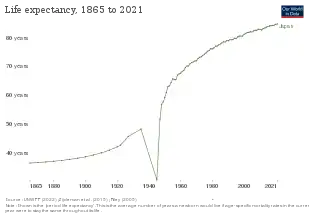 People in Japan have the longest life expectancy at birth of those in any country in the world. Life expectancy at birth was 83 years in 2009 (male 79.6 years, female 86.4 years).[7] This was achieved in a fairly short time through a rapid reduction in mortality rates secondary to communicable diseases from the 1950s to the early 1960s, followed by a large reduction in stroke mortality rates after the mid-60s.[15]