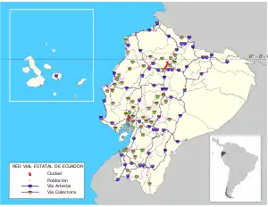 The primary highways of Ecuador are designated with both a name and an alphanumeric designation. The highway designations begin with the letter E followed by a number.