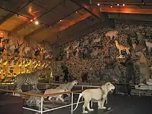 The museum is a covered 40,000 square foot area and features more than 400 species of birds, insects and mammals. Some of the collection of the museum is more than 100 years old and were donated by government agencies, rehabilitation centers and captive breeding programs.[2][3] The taxidermy displays include dioramas and mounted heads.[4] The museum also features the “Big Terror”, a tiger killed in India in 1969, a rhinoceros taken by President Theodore Roosevelt, the Irish elk with 13 foot antlers, penguins from Richard E. Byrd’s South Pole discovery trip, a passenger pigeon and a wooly mammoth.[1][5][6] The museum has been criticized for its amateurishness and out-of-date International Union for Conservation of Nature conservation status ratings.[4]