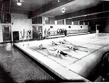 Kay Curtis introduced synchronized swimming in 1934 at the Chicago World's Fair with Norman Ross as her announcer.[2] To her, synchronized swimming was a co-ed sport as it still might be if she had not been transferred overseas (1943–1962) with the Red Cross as recreational director. One of her early disciples was Hal Henning. She staged a production for the Armed Forces in the spectacular fountains and pools and gardens of the palace built by the Kings of the Two Sicilys and used as Allied headquarters in Caserta, Italy. When she finally returned home in 1962 after observing synchronized swimming all over Europe, her baby was a full-blown sport and has been a dominant American aquatic sport and art form ever since. Her pioneer book Rhythmic Swimming (1936) was a classic textbook on the sport she originated.[3] Her no-nonsense ability to say it like it is made her not only the tough mother of synchronized swimming but led Bill Bachrach to call Kay Curtis "the only person I was ever jealous of in swimming".[4]