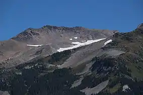 ![]() A portion of Ladd Glacier is visible below Barrett Spur, 7,863 feet (2,397 m). Barrett Spur separates Ladd Glacier from its eastern neighbor, Coe Glacier. | |