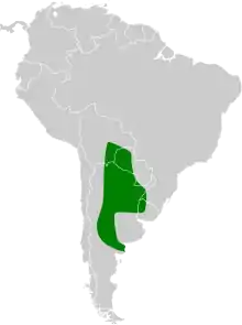 The nominate subspecies of the lark-like brushrunner is the more widespread of the two. It is found in southern Bolivia, northern and eastern Argentina, northwestern Uruguay, and slightly into the southernmost Brazilian state of Rio Grande do Sul. Subspecies C. a. campicola is found in southeastern Bolivia and western Paraguay.[7] The species inhabits open to semi-open landscapes including arid lowland scrublands, arid Gran Chaco woodlands, savanna, pastures with trees, and to a lesser extent agricultural fields. In elevation it ranges from near sea level to 500 m (1,600 ft).[7][8][9]