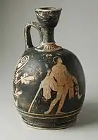 A lekythos (Ancient Greek: λήκυθος; pl.: lekythoi) is a type of ancient Greek vessel used for storing oil, especially olive oil. It has a narrow body and one handle attached to the neck of the vessel, and is thus a narrow type of jug, with no pouring lip; the oinochoe is more like a modern jug. In the "shoulder" and "cylindrical" types which became the most common, especially the latter, the sides of the body are usually vertical by the shoulder, and there is then a sharp change of direction as the neck curves in; the base and lip are normally prominent and flared. However, there are a number of varieties, and the word seems to have been used even more widely in ancient times than by modern archeologists.[1] They are normally in pottery, but there are also carved stone examples.