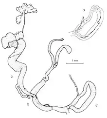 Reproductive system: Vagina is more than twice the length of the oviduct. Oviduct about half as long as the proximal part of the pedunculus, which is longer than the distal part. Basally the pedunculus is much broader than the adjoining oviduct. The bursa of the bursa copulatrix is separate from the spermoviduct; it reaches hardly further than the diverticulum. Male part of the genitalia with a single retractor muscle, without flagellum or caecum. Penis is tripartite as far as can be judged on the basis of the transparent genital slides, forming a loop with a sharp curvature about halfway. Proximal half formed by (1) a short segment with a relatively simple luminal surface, followed by (2) a clearly broader and about three times longer part with some longitudinal ridges with zigzag borders. Distal half, with the insertion of the retractor muscle slightly distal from halfway, about as broad or little broader than the narrow part of the proximal half; penial segment (3) with a relatively simple luminal surface; epiphallus (4) with a vague pattern of small pustulae, most clearly seen at its distal end. Vas deferens, a short part of the penis and nearly as much as the proximal half of the vagina united by a common sheath.[1]