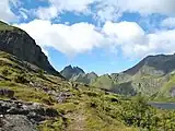 The rocky terrain of the protected area is very rugged and difficult to access in places, but there are many trails and a few crossings of the mountain range. These tours include, for example, the crossing from Vinstad to the sandy west coast of Bunesstrand or the road from the village of Å along the southern shore of Lake Ågvatnet and over a steep ridge to Lake Stokkvikvatnet and Stokkvika Bay.[6] However, the bay of Stokkvika with the adjacent valley is excluded from the national park because of its specific history: this narrow valley about 2 km long was once inhabited, as evidenced by archives from 1634. During the Second World War, there was an equipment warehouse and between 1952 and 1963 the Norwegian Ministry of Defense used the site as a military firing range.[8]