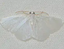 The white spring moth has a wingspan of 15–23 mm and rests with its wings open, exposing both its forewings and hindwings. Its head, body and all four wings are solid white, lack markings and appear shiny or translucent. The outer margins of all four wings are fringed.[2]