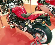 In late 2005, a larger 910 cc engine was added to the range. The 998 cc engine from the F4 1000 S was taller than the 750 cc unit and could not be fitted.[5] The 750 engine's bore was increased by 2.2 mm to 76 mm and the stroke by 6.3 mm to 51 mm to give 909 cc displacement.[6] A top of the range model using the 1078 cc engine from the F4 was added in 2007,[7] and a 982 cc variant in 2008.[8]
