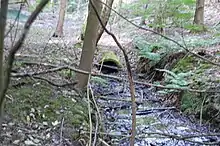 The main source of the Mardyke is in Holden's Wood between Great Warley and Little Warley.[1] It flows roughly 11 miles (18 km) from the source to the Tideway of the Thames at Purfleet, close to the Queen Elizabeth II Bridge. There are two tributaries flowing south from Thorndon Country Park, in the grounds of Thorndon Hall. One of these flows south from Old Hall Pond. The pond has a sluice gate that could be opened to allow the water to flow over an artificial waterfall – the sort of water feature popular with landscape gardeners such as Lancelot "Capability" Brown who landscaped the grounds of Thorndon Hall in the 18th century, although the pond itself dates from the 13th century.[2] Another tributary flows west from Dunton Plotlands section of the Langdon Nature Reserve in Langdon Hills and another flows east from Upminster.
